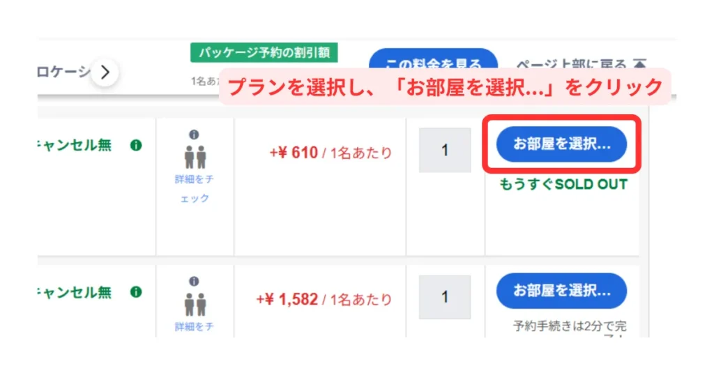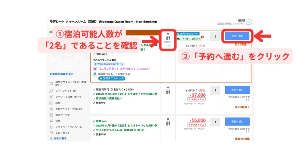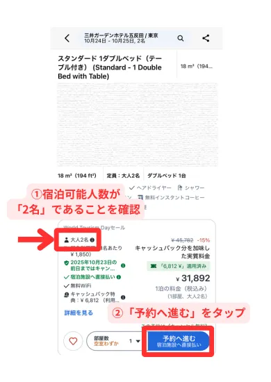 プランの宿泊可能人数が「2名」であることを確認し、「いますぐ予約!」をタップ