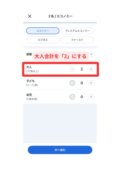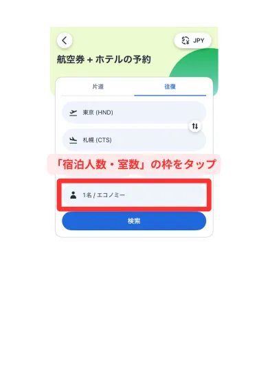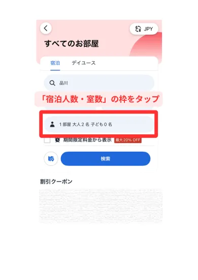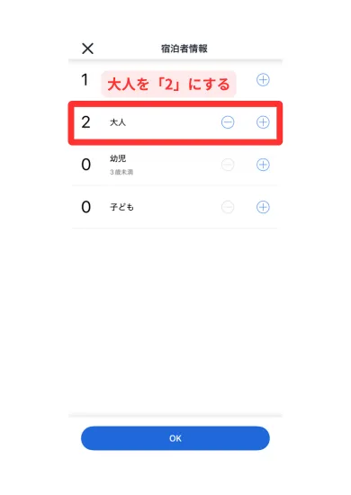 宿泊条件を設定し、「宿泊人数・室数」の枠をタップ
