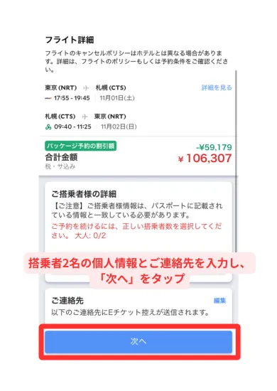 ご連絡先と搭乗者2名の個人情報を入力し、「お支払い手続きへ」をタップ