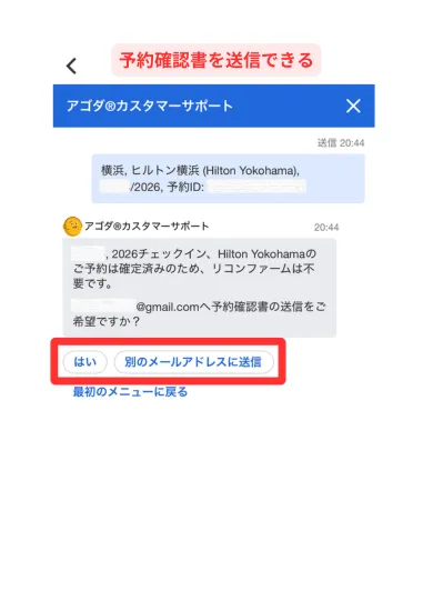 アゴダアカウントにログインすると、デスクトップ版・モバイル版ウェブサイトの場合は「予約確認」メニューで、アゴダアプリの場合は「予約確認」タブまたは「旅程」タブから「予約確認」に進むことで、ご予約内容をご確認いただけます。ご予約内容にアクセス後、[予約確認書の再送信]をクリックしてください。このとき、予約確認メールを再送するメールアドレスを編集することもできます。その後、予約確認メールが届きます。