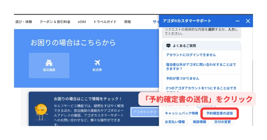 ここまでにご紹介した方法で予約確認できない場合は、Agoda公式サイトのお困りの場合はこちらからを確認しましょう。