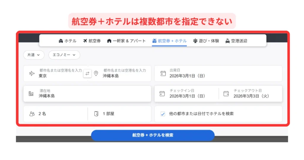 Agoda の航空券+ホテルで複数都市へ旅行したい場合、航空券とホテルを別々に予約する必要があります。1