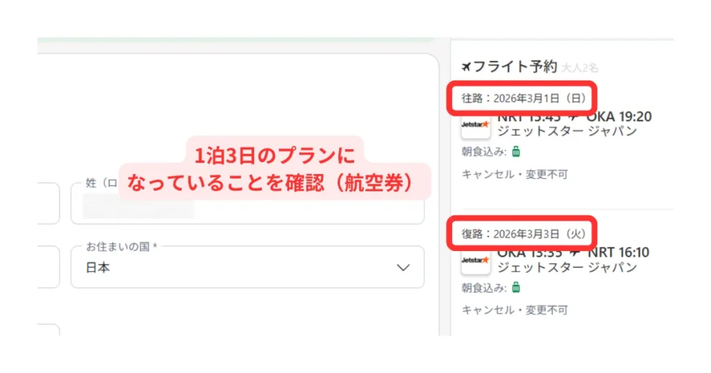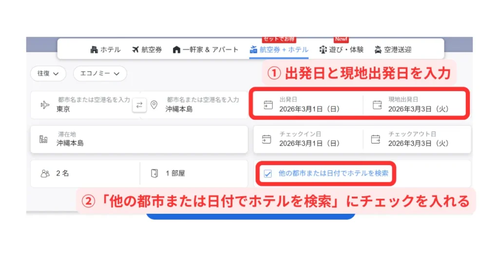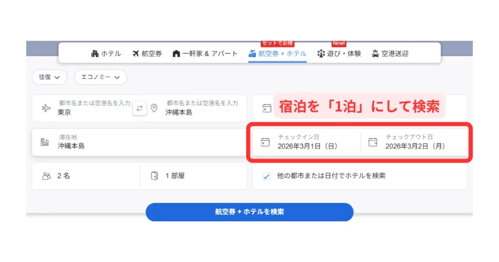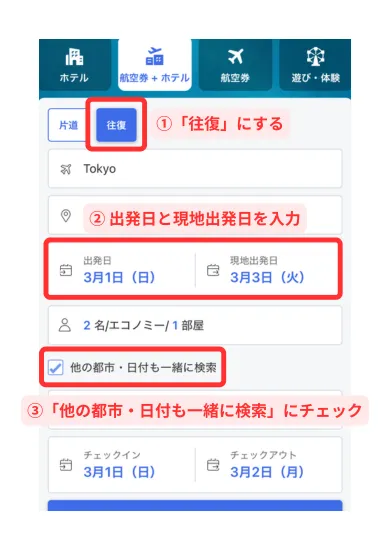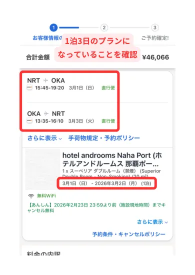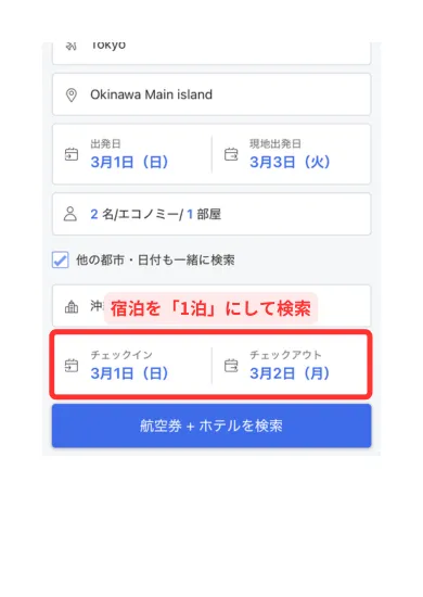 また、2 日目のホテルは帰りの空港までの移動距離を確認しながら予約しましょう。