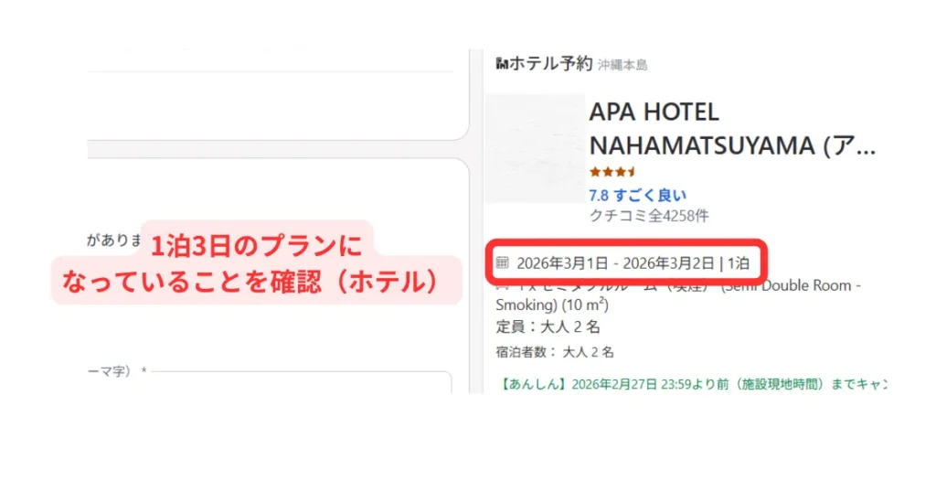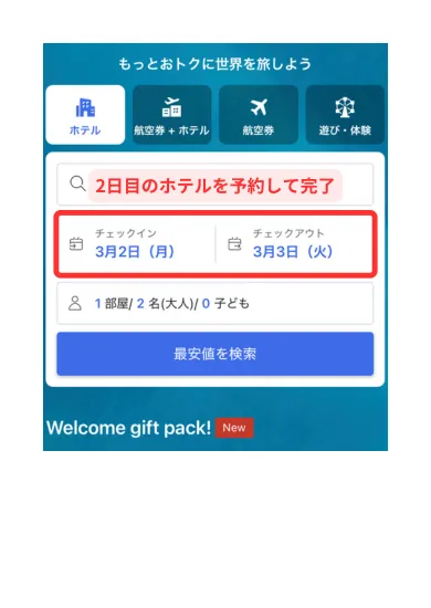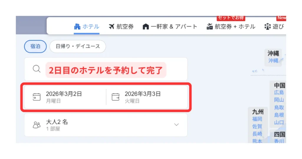1泊目と2泊目を違うホテルにする場合、予約2回行うことで、あわせて「2泊3日」になります。