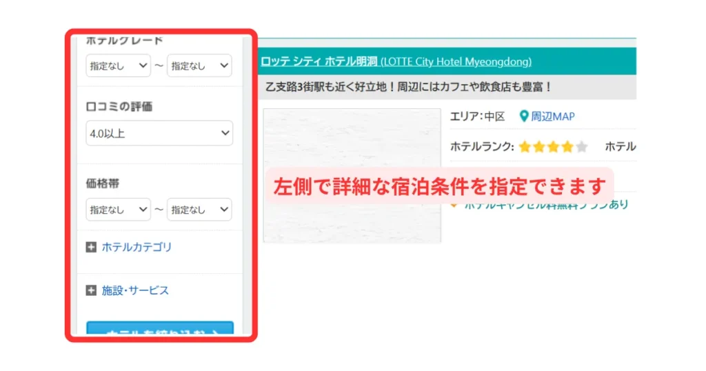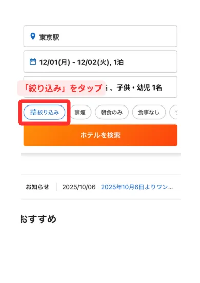 部屋数を「2部屋」にし、部屋ごとの人数を指定して検索