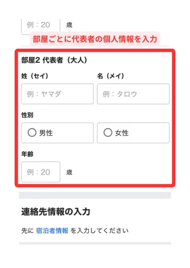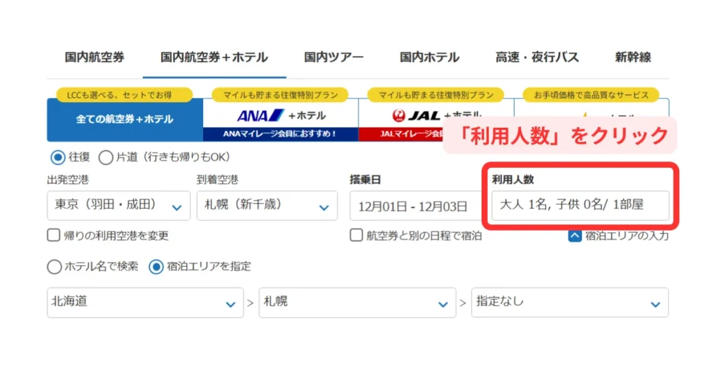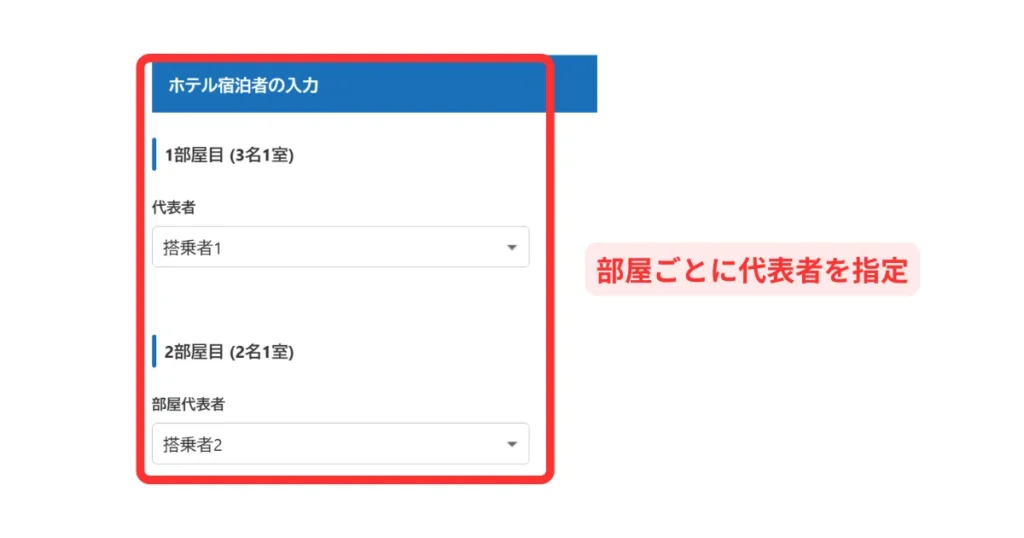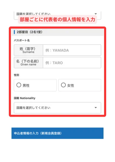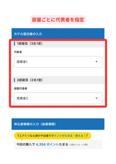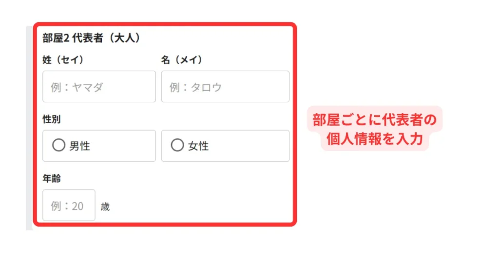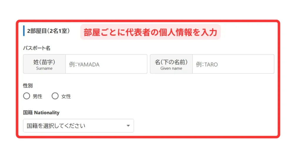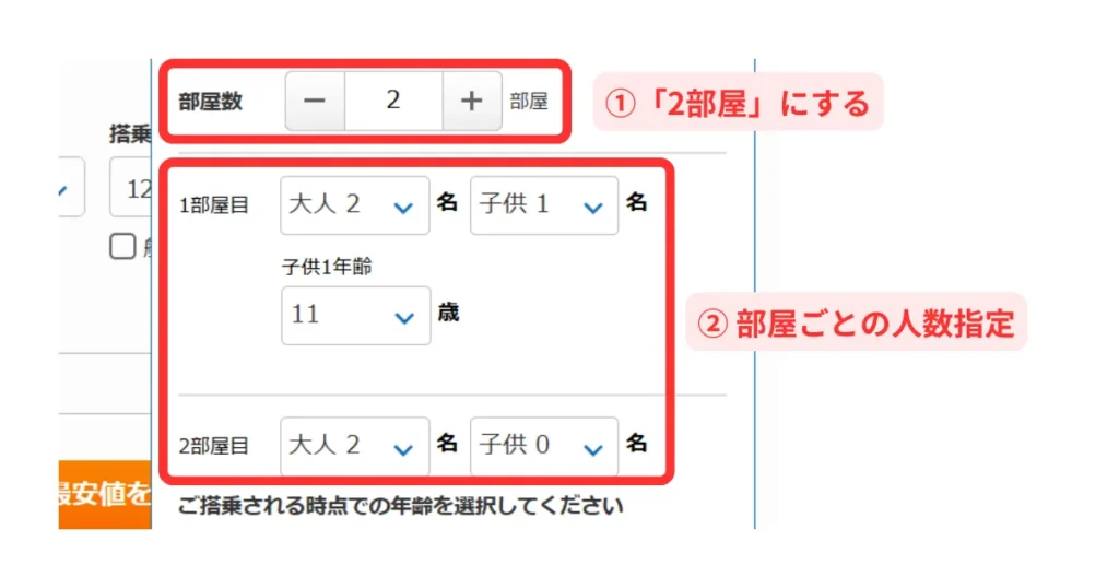 部屋数を「2部屋」にし、部屋ごとの人数を指定