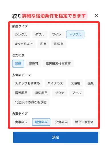 全プランで部屋ごとに異なる宿泊人数の設定ができます。
