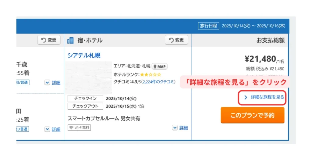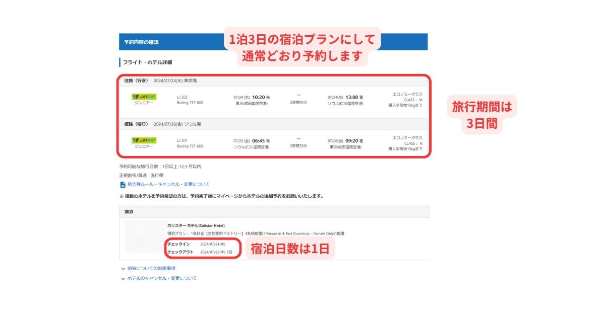 - 航空券+ホテルは「1泊3日」と「1泊」をそれぞれ予約