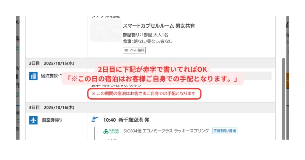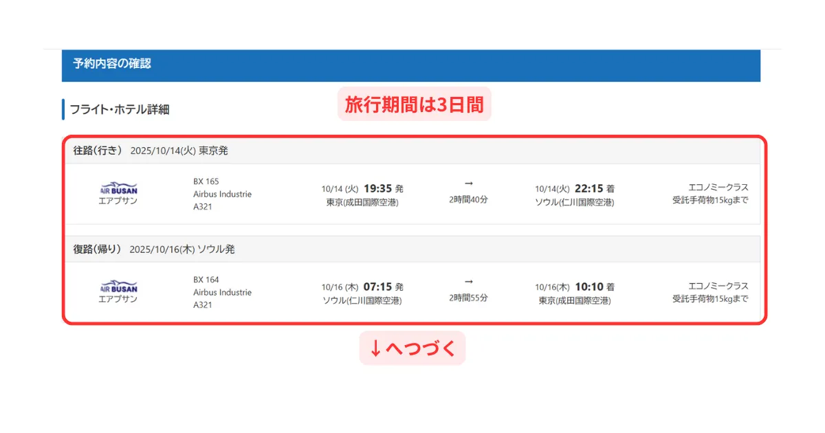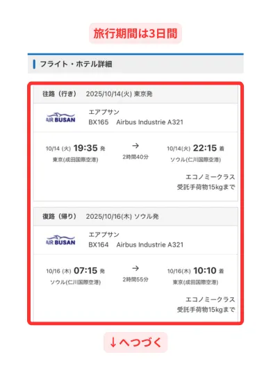 - 航空券+ホテルは「1泊3日」と「1泊」をそれぞれ予約する