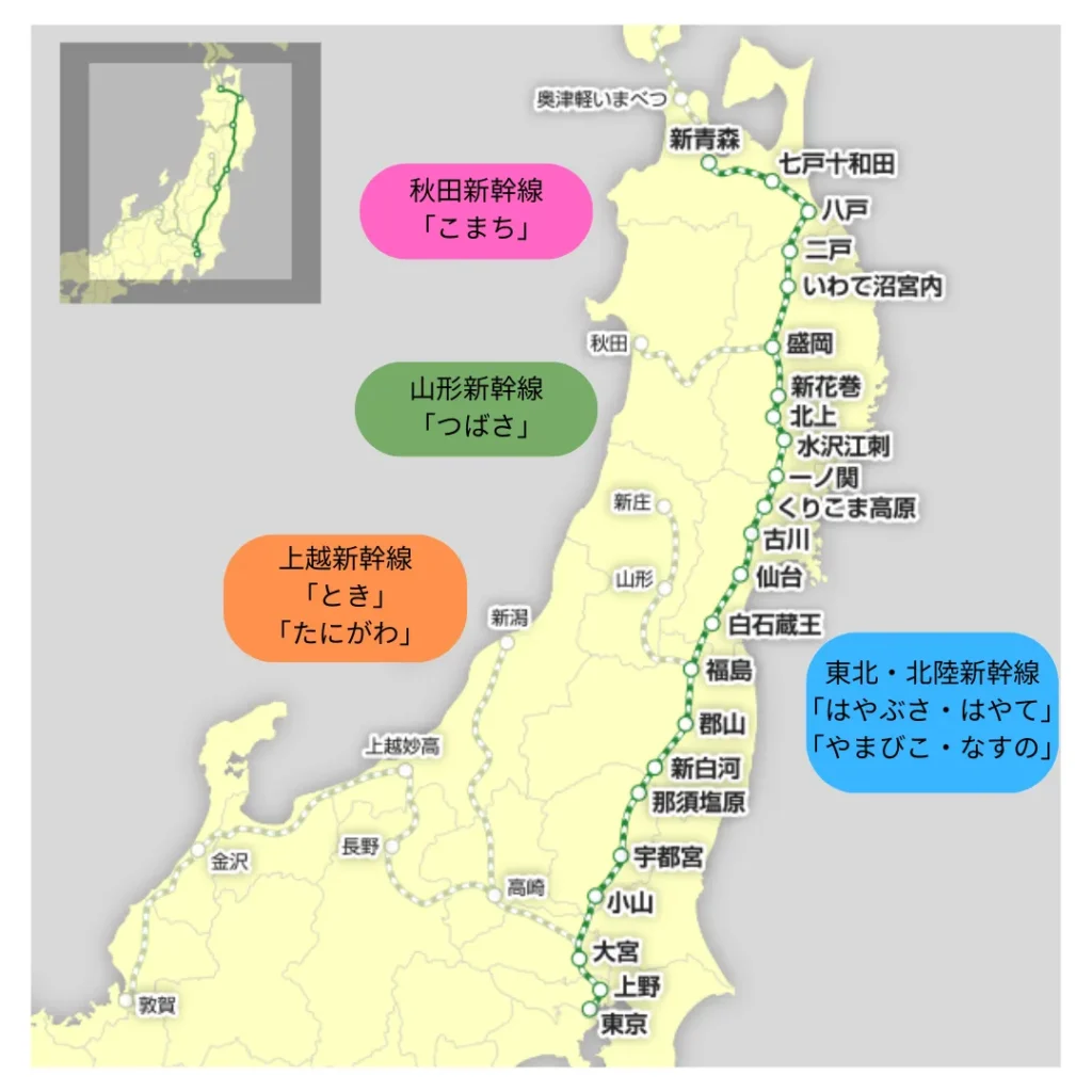 東日本における区間別の新幹線の種類は下表になります。