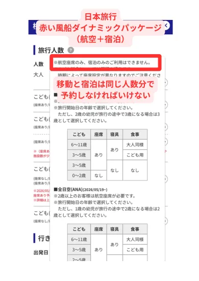 ほとんどの旅行サイトは、移動と宿泊を同じ人数にしなければいけません。