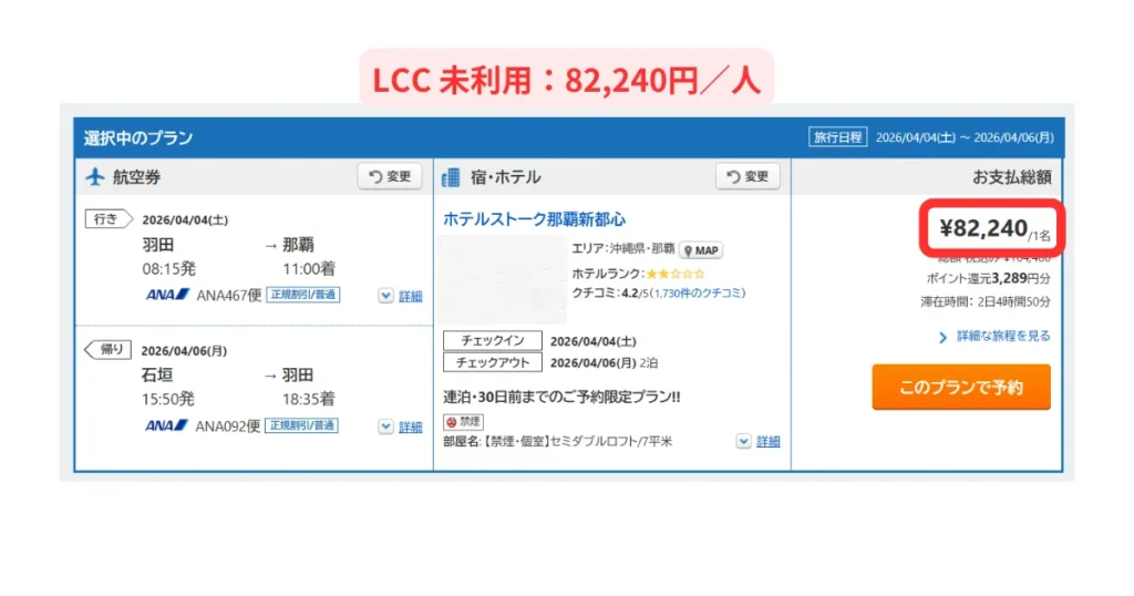 このケースの場合、LCC を利用すれば 1 人当たり約 4 万円おトクに旅行できます。