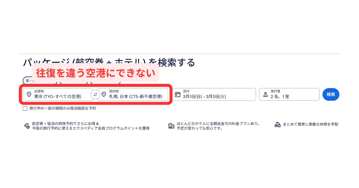 エクスペディアの航空券+ホテルは往復を違う空港にすることができません。1
