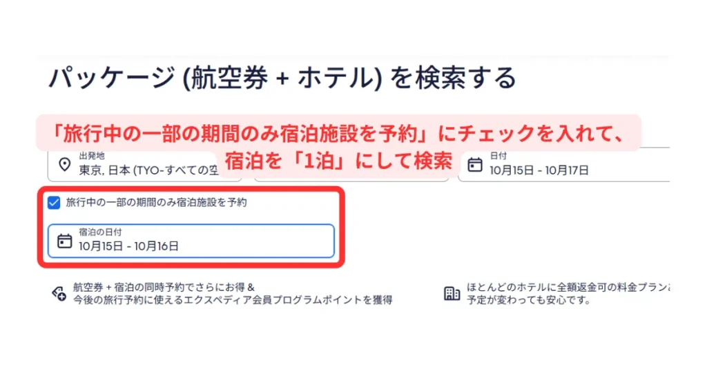 エクスペディアの航空券パックで1泊目と2泊目を違うホテルにする場合、予約手続きを2回行うことで、あわせて「2泊3日」になります。
