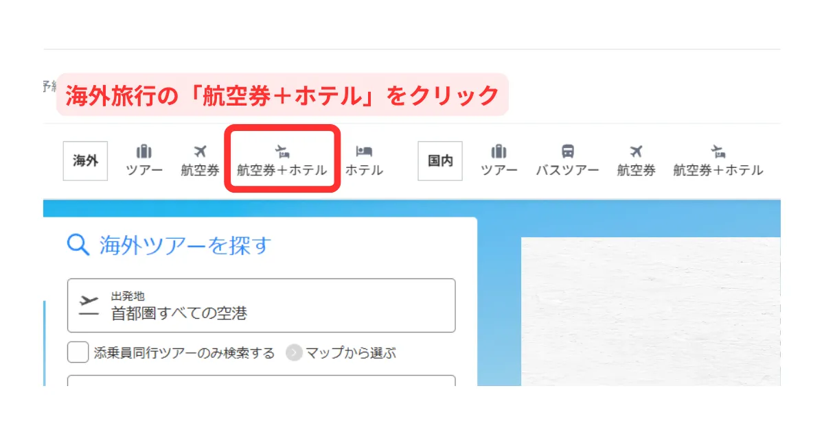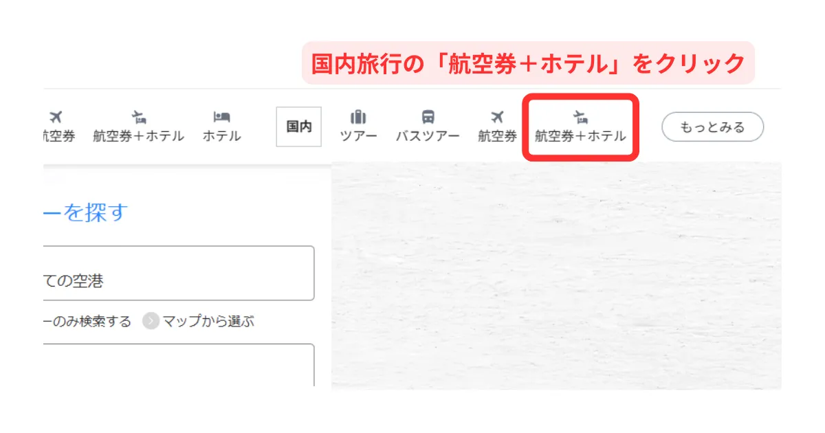 国内旅行の「航空券+ホテル」をクリック