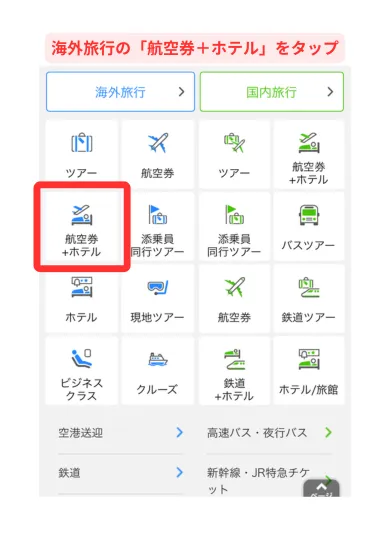 海外旅行の「航空券+ホテル」をタップ