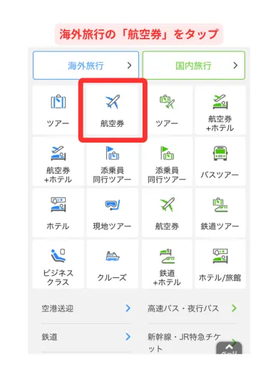 海外旅行の「航空券」をタップ