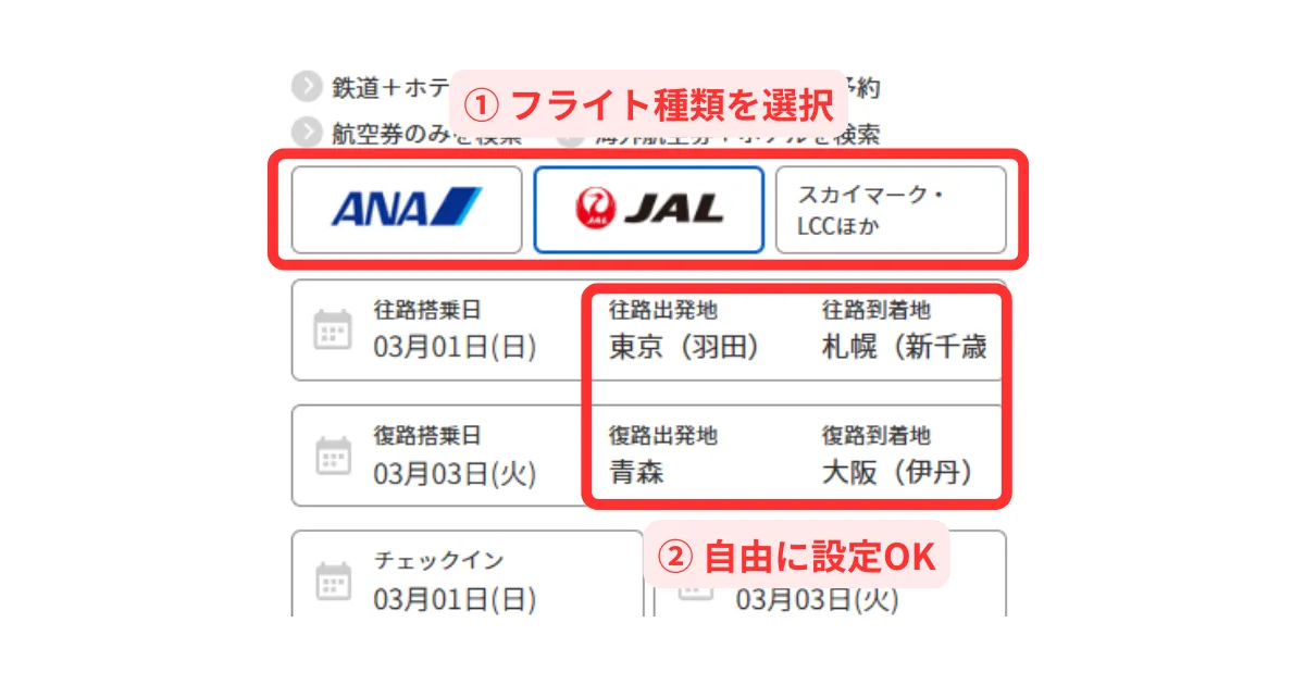 HISの国内航空券+ホテルで行きと帰りの空港を変える方法