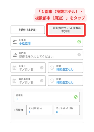 「 1 都市(複数ホテル)・複数都市(周遊)」をタップ