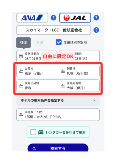 往復の出発・到着空港を自由に設定して検索