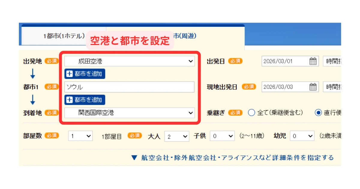 空港と都市を設定して検索