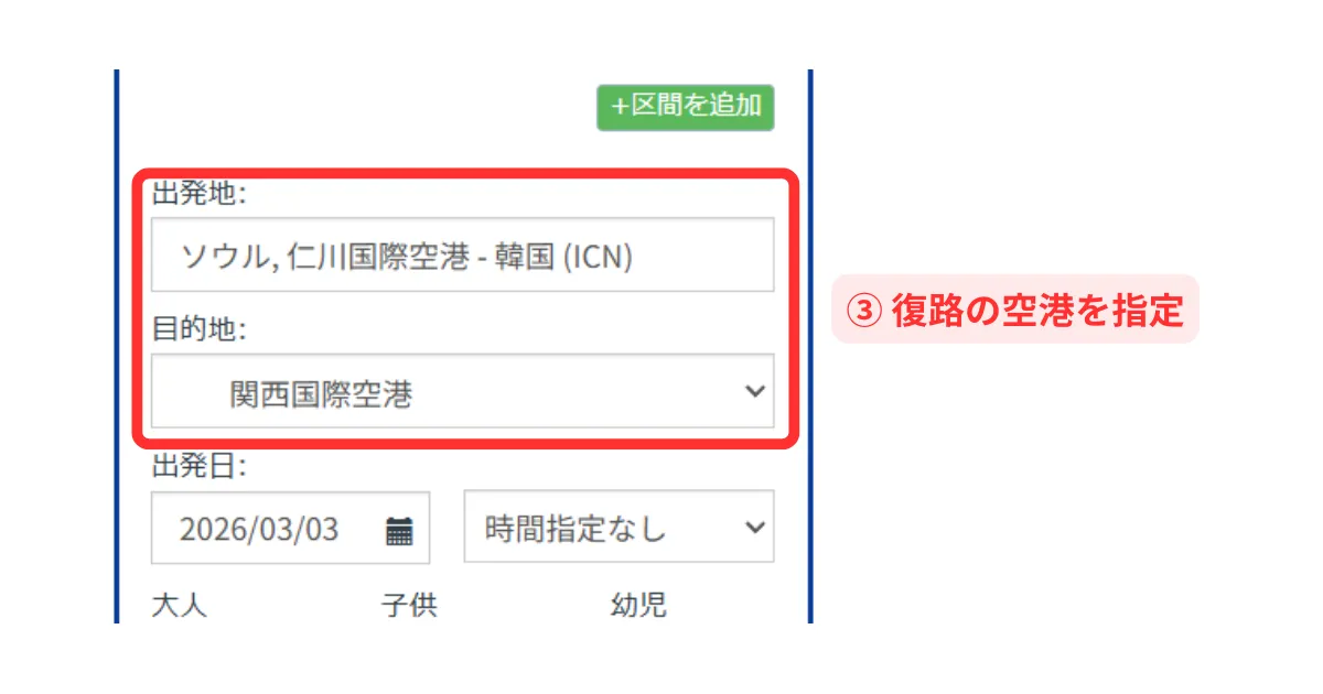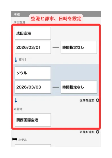 行きと帰りの空港を設定する