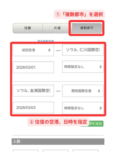 - 往復の空港、日時を指定
