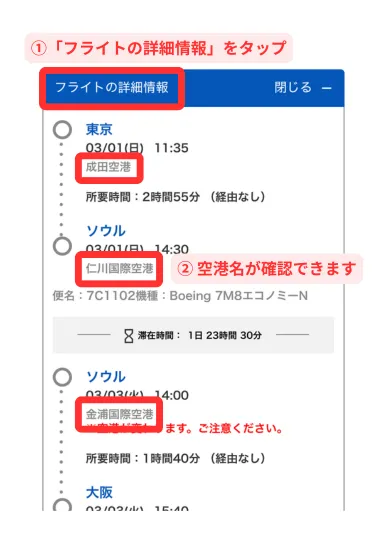 - 空港名が確認できます
