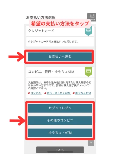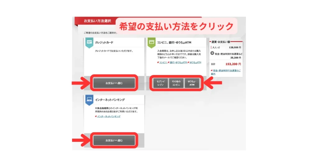 「予約内容確認」画面まで進んでからは、支払い方法によってやり方が異なります。