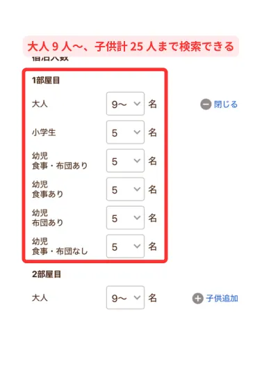 - 大人 9 人~ × 10 部屋 = 90 人~ 検索OK