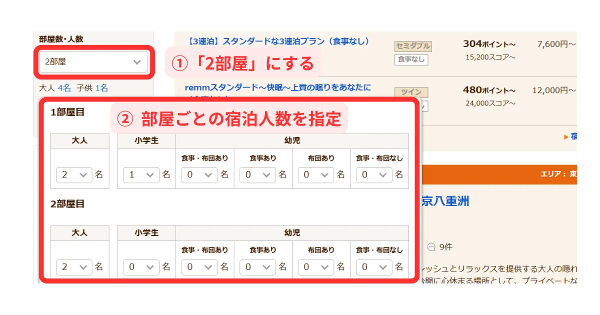 国内の宿・ホテルを二部屋予約する方法は 2 通りあります。