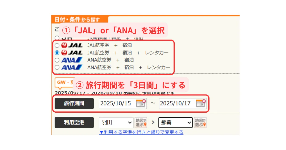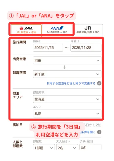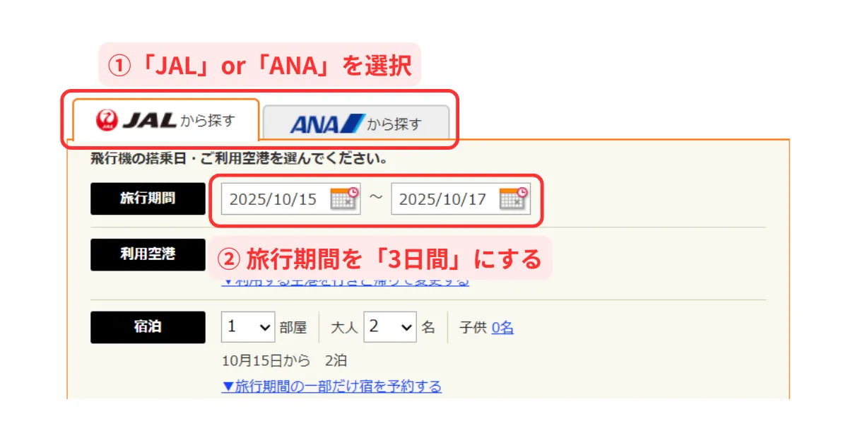 じゃらんの国内航空券パックで 1 泊目と 2 泊目を違うホテルにする方法は 2 通りあります。