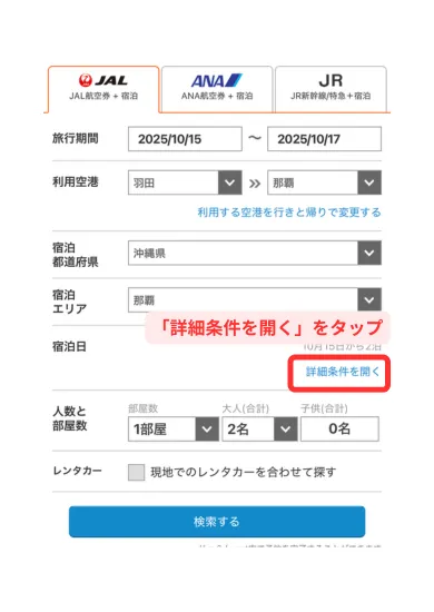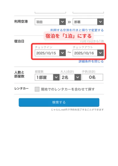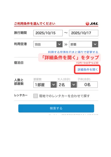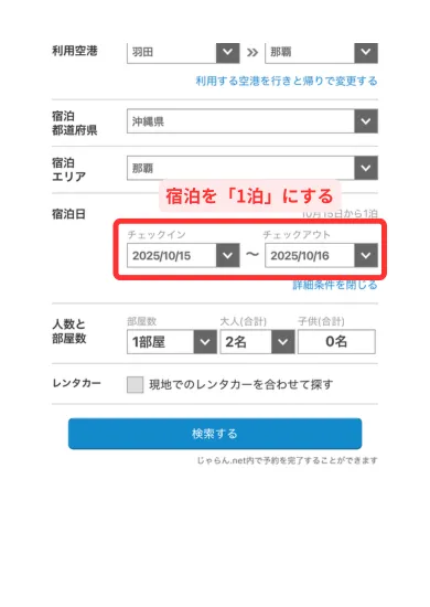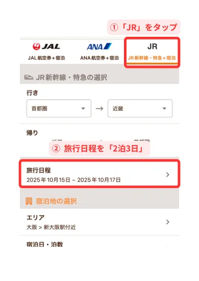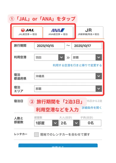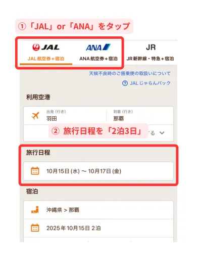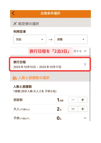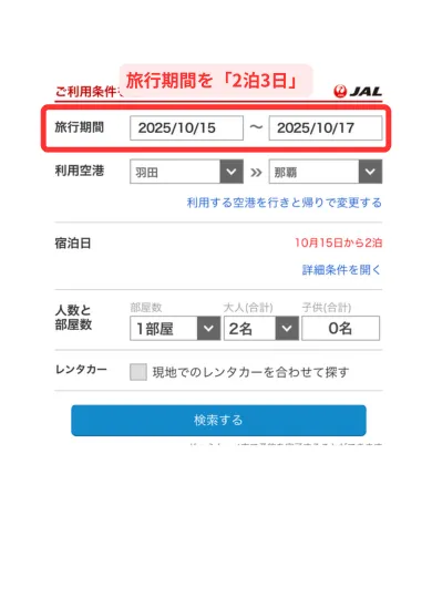 「JAL」or「ANA」をタップし、旅行期間を「2泊3日」にする