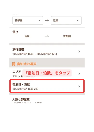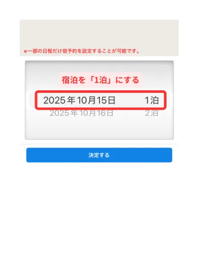 旅程確認画面の「宿泊施設削除」をタップすると、一部の日程を不泊にできます。