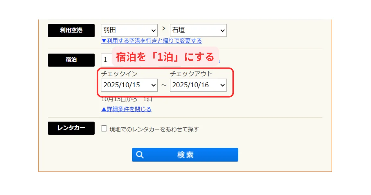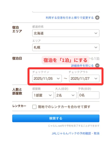 じゃらんの国内航空券パックで1泊目と2泊目を違うホテルにする方法
