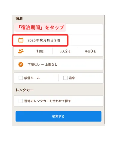 例として、東京で2泊する場合の予約手順は以下の通りです。