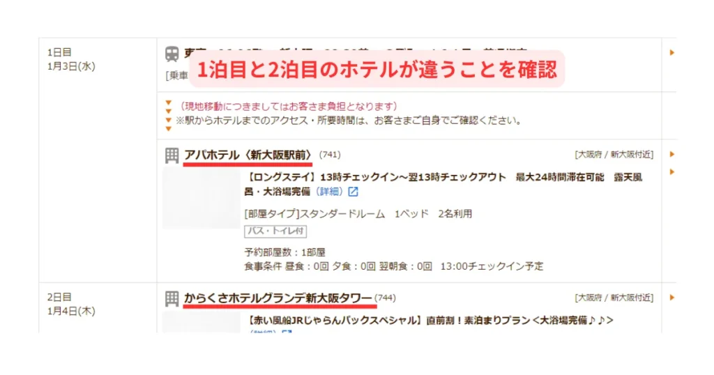 じゃらんで1泊目と2泊目を違うホテルにするときの注意点