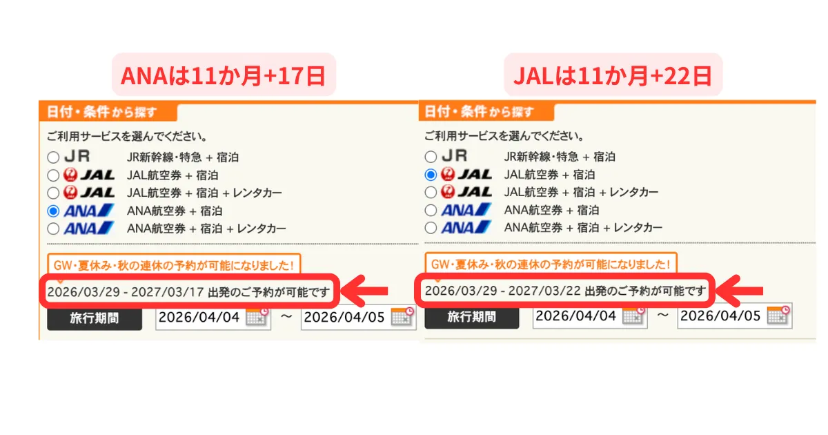 JALじゃらんパックでは、出発日の前日23時59分(予約完了)までご予約いただけます。