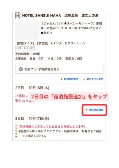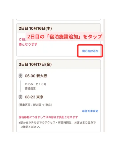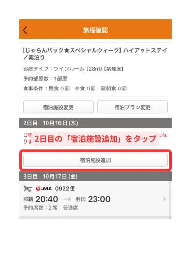 「旅程確認」のページまで進み、2日目の「宿泊施設追加」をタップ