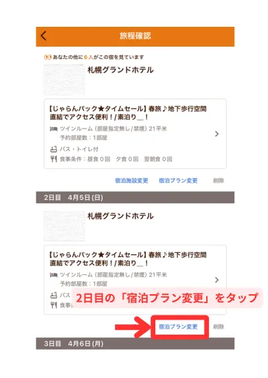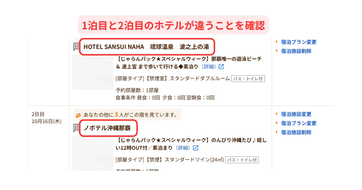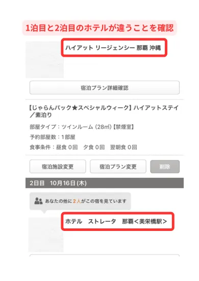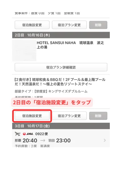 旅程確認画面の「宿泊プラン変更」から、同じホテルに連泊して2日目を違うプランに変更できます。