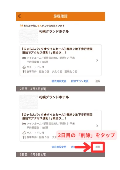 旅程確認画面の「宿泊施設削除」または「削除」をタップすると、一部の日程を不泊にできます。