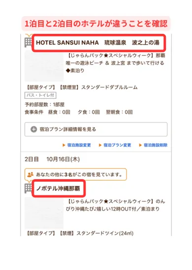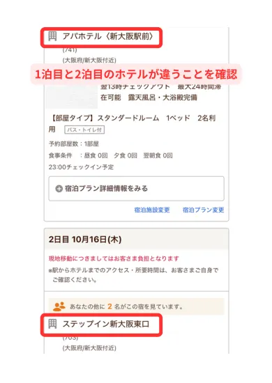 1泊目と2泊目のホテルが違うことを確認して予約を完了させます
