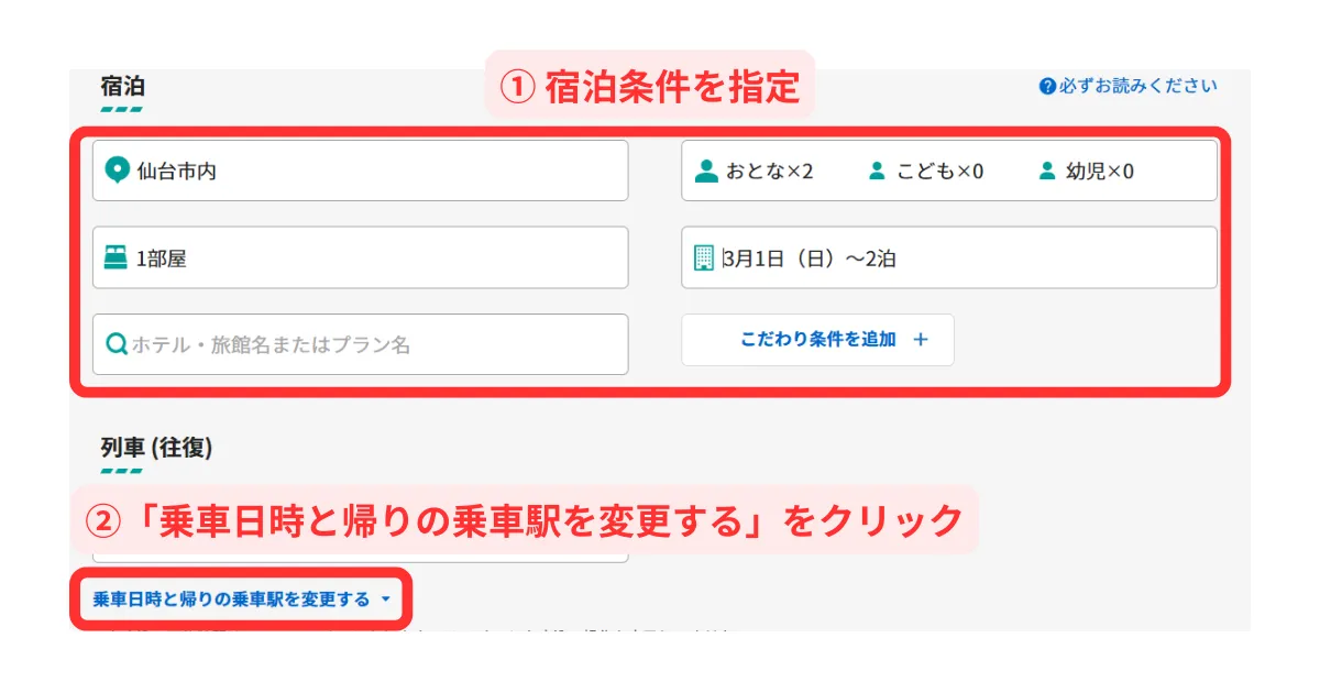 びゅうトラベルのダイナミックレールパックで往復を違う駅にしたい…。