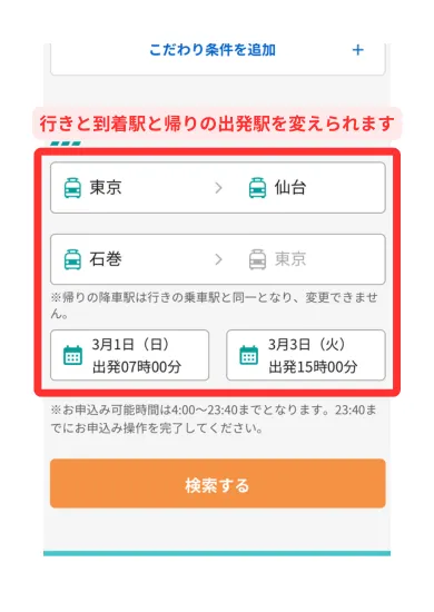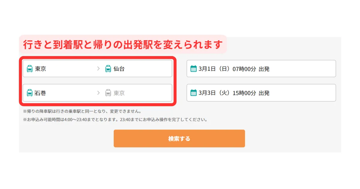 行きの到着駅と帰りの出発駅は広範囲から選べる