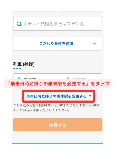 - 「乗車日時と帰りの乗車駅を変更する」から設定可能