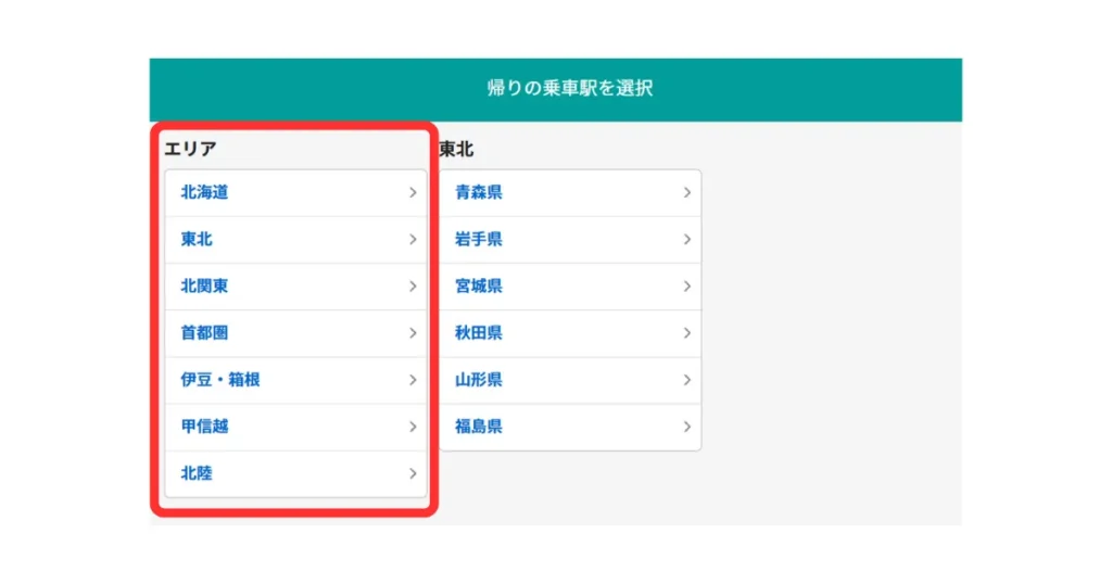 帰りの出発駅は東日本エリアの広範囲の駅を選択できました。