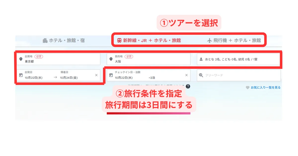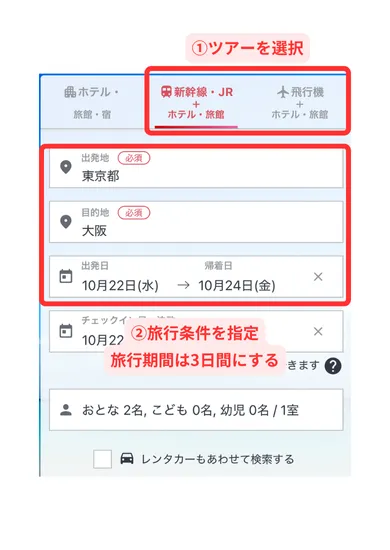 JTBの国内新幹線パック・飛行機パックで1泊3日にする方法