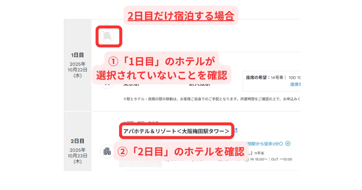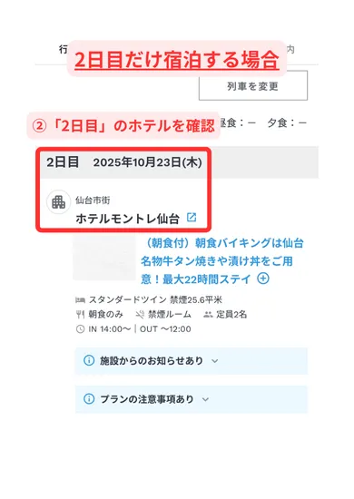 通常どおり検索し、2日目のホテルと新幹線または飛行機を選択し、「選択内容確認」ページまで進みます。