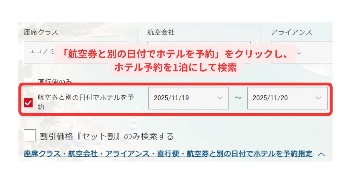 「航空券と別の日付でホテルを予約」をクリックし、ホテル予約を1泊にして検索