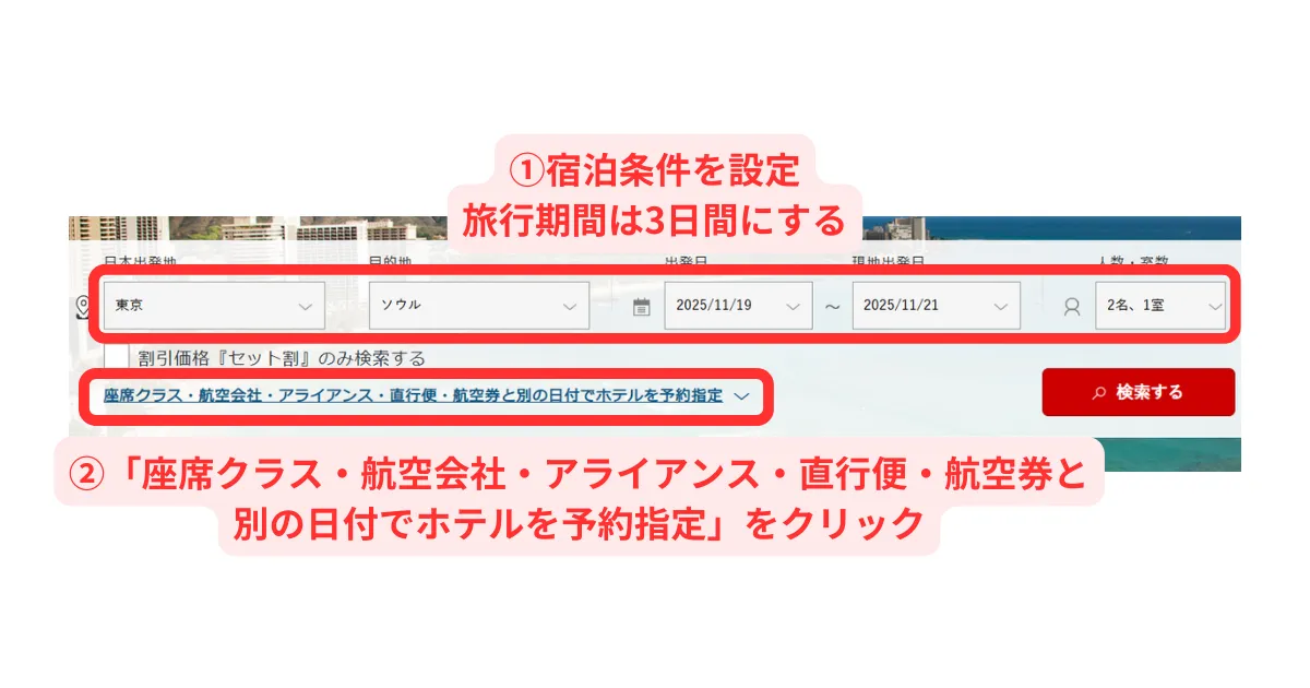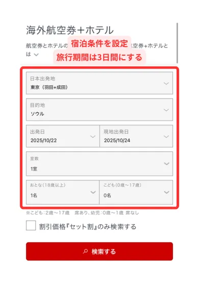 宿泊条件を設定、旅行期間は3日間にして、青文字をクリック